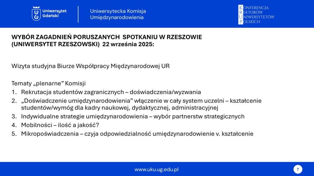 Posiedzenie Uniwersyteckiej Komisji Umiędzynarodowienia KRUP 22-23 września 2025 r. Rzeszów